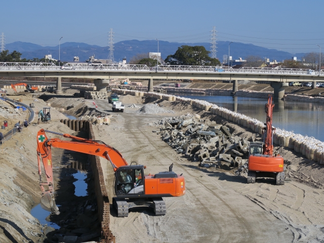 私たちは、護岸整備や河床整正、堤防工事などを通じて、洪水や浸水被害を防ぎ、安全な河川環境づくりを行っています。